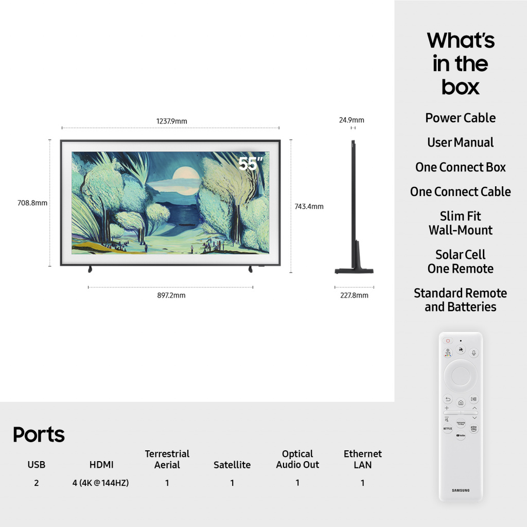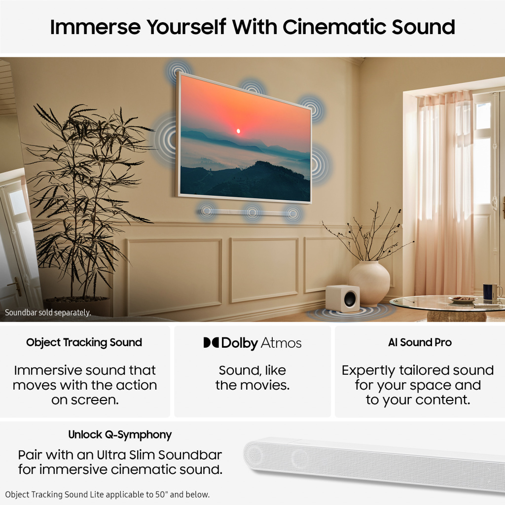 Modern Frame Design & Bezel*, Pantone Validated Colour, with Real Quantum Dots, Matte Display, Art Mode, Dolby Atmos®*, One Connect Box, NQ4 AI Gen2 Processor, Art Store, Slim Fit Wall-Mount In-B